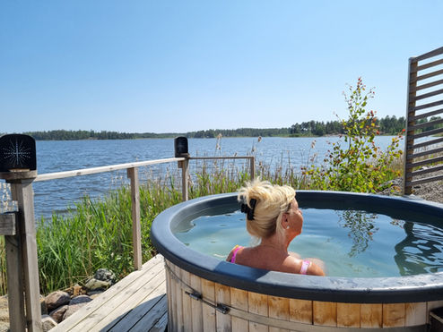 Koppla av i 38 graders värme året om med utsikt över Vänern. Den eluppvärmda badtunnan är varm året om och belägen precis vid sjökanten. Här har ni nära till både vår bastu Rökeriet och ett dopp i Vänern - perfekta kombinationen av varmt och kallt. Hos oss får ert sällskap egen tillgång till badtunnan när ni övernattar i Stranden.